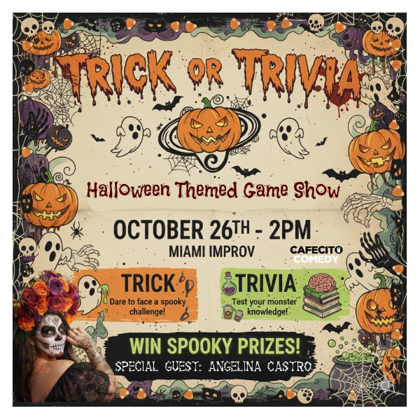 Get ready for a spooktacular night of laughs and thrills at Miami Improv's Trick or Trivia: Halloween Game Show Fueled by Cafecito Comedy!Join us for a frightfully fun evening where your wit and costume could win you some amazing treats! Our very own ghoul-geous special guest host, Angelina Castro, has some Tricks up her sleeve that you won't want to miss!🧛‍♀️Participate in our killer Halloween-themed games for a chance to win spectacular prizes that are so good, it's scary! 🏆 And that's not all – we're giving away a FREE TATTOO! Yes, you heard that right, get some permanent ink-redible art! 🎨💉Courtesy of Vince's Nightmare Tattoos! Our bar will be serving up deliciously devilish drinks to keep your spirits high all night long. Sip on some witches' brew or a vampire's kiss concoction while you watch the spine-tingling competition unfold. 🍹🍸We dare you to come dressed in your most fang-tastic Halloween costumes! 🧟‍♀️🧙‍♂️ Show off your creative side, because we love a good boo-tiful outfit! Want to make your night even more un-boo-lievable? Purchase our VIP tickets and get a FREE SHOT to kick off the festivities! 🥃 It's a deal so good, it's scare-worthy!So, mark your calendars for October 26th at Miami Improv. It's going to be afternoon of howling laughter and creepy-crawly good times! Don't be a scaredy-cat, grab your tickets before they vanish! 🎟️Event Details:🗓️ Date: October 26th📍 Location: Miami Improv🎃 Theme: Halloween Game Show🌟 Special Guest Host: Angelina Castro🎁 Prizes: Spectacular prizes + FREE TATTOO giveaway!🍸 Drinks: Deliciously themed👻 Dress Code: Costumes highly encouraged!🥂 VIP Perk: Free shot & Priority seating with VIP ticket purchase! Get ready to have a monster good time! We can't wait to see you there! 🥳